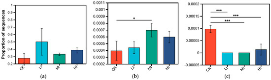 Phyla with significant differences at different levels of disturbance. (a) Bacteroidetes (low intensity significantly higher than other disturbance intensities); (b) Tenericutes; and (c) unclassified_k__Fungi. *: Significant difference, ***: Very significant difference.