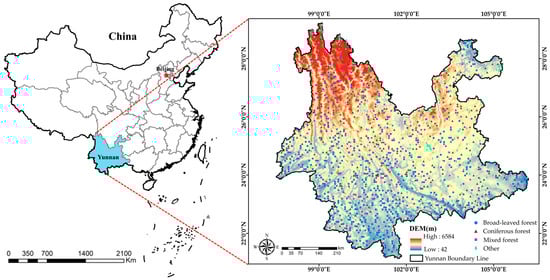 Yunnan Province is located between 21°8′–29°15′ N and 97°31′–106°11′ E, with a total area of 394.1 thousand km2. The topography features high in the northwest and low in the southeast, exhibiting a characteristic step-like descent from north to south. It is primarily a mountainous plateau region, with mountainous areas accounting for 88.64% of the province’s total area. The terrain is divided into two major topographic zones, eastern and western, demarcated by the Yuanjiang Valley and the southern part of the Yunling Mountain Range. The western and southern boundaries of the study area share borders with Vietnam, Laos, and Myanmar, while its northern and eastern boundaries adjoin Guangxi, Guizhou, Sichuan, and Tibet [19]. The province boasts rich and diverse forest vegetation, which is categorized into four primary forest vegetation types, 17 subtypes, and 105 forest types in total. Yunnan is renowned for having the highest plant species diversity in China and is often referred to as the ‘Kingdom of Plants’, Based on data from the Ninth National Forest Resources Inventory of China, as of the year 2021, the total forest area in the province measures 21.0616 million hectares, with a forest stock volume of 1.973 billion cubic meters and a forest coverage rate of 55.04% [20]. The geographical location of the study area is depicted in Figure 1.