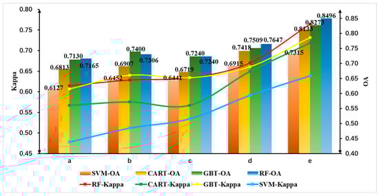 Comparison of overall accuracy and Kappa coefficient of different classification algorithms with different features (a) Spectral features (b) Spectral and vegetation index features (c) Spectral, vegetation index, and texture features (d) Spectral, vegetation index, texture, and principal component analysis features (e) Spectral, vegetation index, texture, principal component analysis, and terrain features.