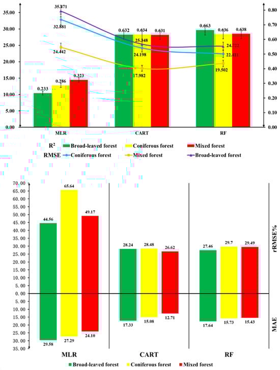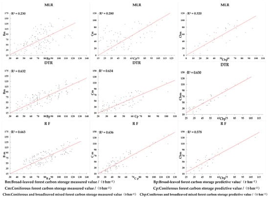 Utilizing sample data on carbon stock for various forest types and 21 highly correlated modeling factors, optimal models for aboveground carbon stock in different forest types were constructed using multivariate stepwise regression, RF regression, and decision tree regression methods. RF and decision tree rank input factors based on their importance and provide modeling contribution values for each factor. The contribution percentages of modeling factors for three forest types in this study are depicted in Figure A3 (Appendix A). The results of the three regression models, obtained after tuning model parameters, are illustrated in Figure 5.