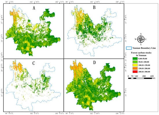Distribution map of carbon stock in Yunnan Province’s forests (A) Carbon stock distribution map of broadleaved forests in Yunnan Province (B) Carbon stock distribution map of coniferous forests in Yunnan Province (C) Carbon stock distribution map of mixed forests in Yunnan Province (D) Carbon stock distribution map of forests in Yunnan Province.
