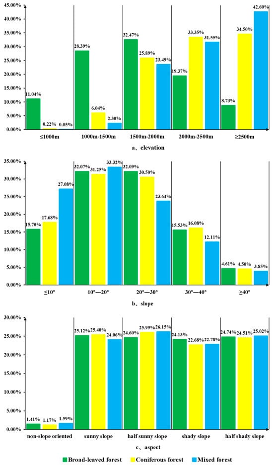 By overlaying the aboveground carbon stock distribution in the forests of Yunnan Province with DEM data, distinct carbon stock scenarios can be obtained for different elevation gradients, slopes, and aspects, as illustrated in Figure 8. In the vertical space, the carbon stock of broad-leaved forests is primarily distributed within the altitude range of 1500 to 2000 m, accounting for 32.47% of the total aboveground carbon stock of broad-leaved forests in Yunnan Province. The carbon stock of coniferous forests is predominantly situated in regions above 2000 m elevation, while the carbon stock of mixed coniferous and broad-leaved forests is mainly located in areas above 2500 m, constituting 42.60% of the total aboveground carbon stock of mixed forests in Yunnan Province. Overall, the carbon storage of forests in Yunnan Province is mainly concentrated in areas above 1500 m. In terms of slope, the carbon stock in the forests of Yunnan Province is predominantly distributed within the 10–30° range, accounting for 60.95% of the total aboveground carbon stock in Yunnan’s forests. Regions with slopes exceeding 40° exhibit lower proportions of forest carbon stock due to the steeper incline. Moreover, aside from areas without a specific slope direction where the carbon stock proportion is relatively minor, the distribution disparities of aboveground carbon stock in the forests of Yunnan Province among various slope directions are comparatively small, with distinctions not being prominently evident.
