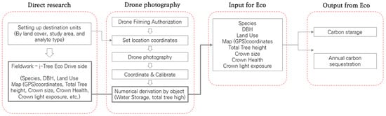 In this study, based on a review of carbon storage and sequestration by trees, the carbon storage and sequestration of urban parks was calculated by tree species, study area, and analysis area type using the i-Tree Eco model (ver.6.0, United States Department of Agriculture, USDA, Washington, DC, USA). The i-Tree Eco model used in this study requires an accurate understanding of the current status of park trees. After conducting a field survey, the results of carbon storage and sequestration were obtained using the i-Tree Eco model, and planting strategies that can increase carbon sequestration in urban parks are proposed (Figure 1).