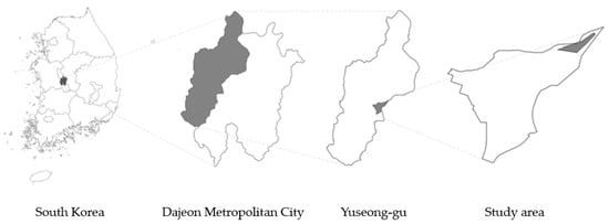 This study focuses on Yulim Park, which is located in Yuseong-gu, Daejeon, South Korea, as shown in Figure 2. The park covers a vast area of 57,400 square meters, out of which 36,583 square meters are dedicated to green spaces, which makes up approximately 63.7% of the park’s total area. The built-up area of the park is 20,817 square meters, which accounts for around 26.3% of the park’s total area, and it includes a unique peninsula that extends over 2600 square meters. Yulim Park boasts a diverse collection of flora, including 64,082 seasonal trees and 135,450 perennial plants.