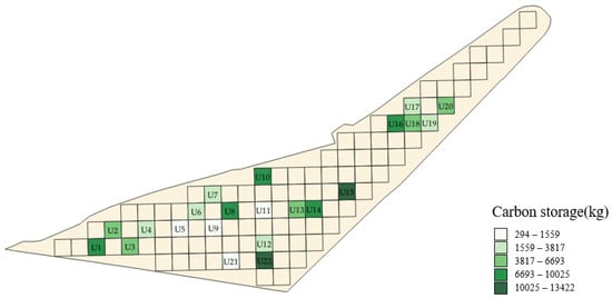 In this comprehensive study, which included 22 designated study areas labeled U1 through U22, the i-Tree Eco model meticulously calculated carbon storage for each specific study area. The analysis identified U15, U22, U8, U1, and U10 as having particularly high levels of carbon storage (Table 5). These areas are characterized by the prevalence of high-density trees, coupled with significant stem diameter, stem width, and height parameters, which are closely related to tree biomass.
