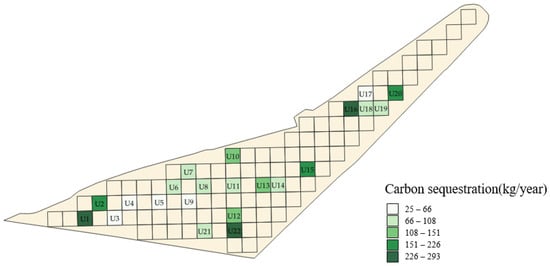 Shifting the focus to carbon sequestration, the study highlighted U22, U16, U1, U20, and U2 as having the highest levels of this critical ecological process. In particular, U22 and U1 emerged as areas with both elevated carbon storage and sequestration (Table 5). A common feature characterizing these areas is the substantial presence of planted trees, highlighting the influential role of tree density in the carbon dynamics of urban environments.