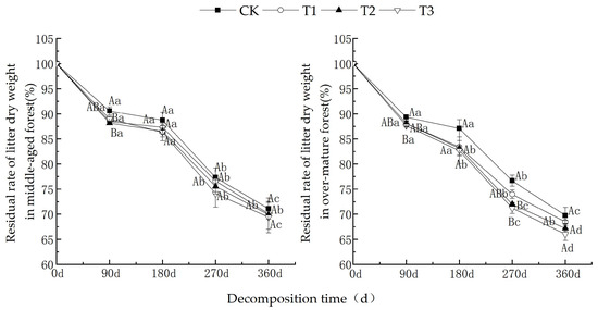 As shown in Figure 1, as the decomposition time increased, the dry weight residual rates of litter from middle-aged and over-mature forests exhibited a decreasing trend under various UV-B radiation intensities. The dry weight residual rates during the 180~270 d period were higher compared to those in the 0~180 d and 270~360 d periods. After one year of decomposition, under different UV-B radiation treatments, the dry weight residual rates of litter from middle-aged C. lanceolata forests were CK (71.1%) > T1 (70.1%) > T2 (69.9%) > T3 (69.4%). For C. lanceolata litter in over-mature forests, the dry weight residual rates were as follows: CK (69.7%) > T1 (68.5%) > T2 (67.2%) > T3 (66.0%).