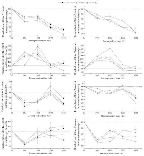 As shown in Figure 2, the carbon (C) residual rates of litter from middle-aged and over-mature C. lanceolata forests exhibited a decreasing trend with prolonged decomposition time. Over the 360-day decomposition period, the C residual rates under various UV-B radiation intensities consistently remained below 100%, indicating a distinct carbon net release phenomenon. After 360 days of decomposition, the C residual rates for middle-aged forest litter ranged from 44.58% to 56.94%, while those of over-mature forest litter ranged from 51.63% to 60.92%. The nitrogen (N) residual rate initially increased, followed by a decrease during the decomposition process. Within the 0–270-day decomposition period, the N content residual rates for middle-aged and over-mature forest litters both exceeded 100%, signifying a state of nitrogen enrichment. However, from 270 to 360 days, nitrogen enrichment in middle-aged forest litter was observed only under CK and T3 conditions, while over-mature forest litter exhibited nitrogen enrichment under CK and T1 conditions. After 360 days of decomposition, the N residual rates for middle-aged forest litter ranged from 42.49% to 153.90%, and those of over-mature forest litter ranged from 65.50% to 138.37%. The phosphorus (P) residual rates of litter from middle-aged and over-mature C. lanceolata forests demonstrated a general decrease–increase–decrease under various UV-B radiation intensities. Notably, only around the 270-day mark did middle-aged forest litter under CK conditions exhibit significant enrichment, while during other decomposition periods, it predominantly signified a state of P release. After 360 days of decomposition, the P residual rates for middle-aged forest litter ranged from 75.19% to 88.92%, whereas those of over-mature forest litter ranged from 48.81% to 71.28%. The potassium (K) residual rate during both middle-aged and over-mature forest litter decomposition generally showcased an initial decrease followed by an increase before stabilizing. During the 270–360-day decomposition period, middle-aged forest litter displayed K enrichment under T1 and T2 conditions, while it was mostly indicative of a release under other UV-B radiation treatments. In contrast, over the entire 360-day decomposition period, the over-mature forest litter consistently exhibited a net release of K. After 360 days of decomposition, the residual K content for middle-aged forest litter ranged from 64.77% to 119.95%, and from 33.01% to 74.78% for over-mature forest litter.