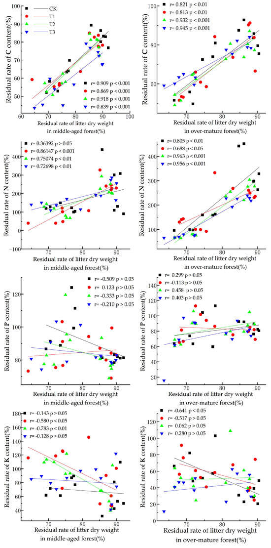 As shown in Figure 3, the dry weight residual rate of litter from middle-aged forests exhibited a highly significant positive correlation (p < 0.001) with the C residual rate under different UV-B radiation conditions. It also showed a highly significant positive correlation with the N content residual rates under T1, T2, and T3 conditions, while the correlation was not significant under natural light conditions. However, no significant correlation was observed between the residual rate of phosphorus (P) and the different UV-B radiation intensity treatments. Under the T1 conditions, we observed a significant negative correlation (p < 0.05) with the K residual rate, while the correlation is extremely significant under the T2 condition (p < 0.01). Nevertheless, no significant correlation was observed under the CK and T3 conditions.