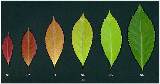 Six stages of O. fragrans ‘Wucaigui’ leaf development. S1: grayish-brown; S2: moderate brown; S3: dark greenish-yellow; S4: strong yellow-green; S5: yellow-green; S6: moderate olive-green.