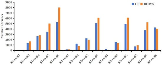 In total, 48 up-regulated genes and 28 down-regulated genes were found in S1 vs. S2. There were 1399 up-regulated and 1671 down-regulated genes in S1 vs. S3. There were 2643 up-regulated and 2847 down-regulated genes in S1 vs. S4. There were 3491 up-regulated and 4999 down-regulated genes in S1 vs. S5. There were 5267 up-regulated and 8014 down-regulated genes in S1 vs. S6. There were 188 up-regulated and 178 down-regulated genes in S2 vs. S3. There were 1244 up-regulated and 835 down-regulated genes in S2 vs. S4. There were 2258 up-regulated and 1977 down-regulated genes in S2 vs. S5. There were 5083 up-regulated and 6074 down-regulated genes in S2 vs. S6. There were 264 up-regulated and 84 down-regulated genes in S3 vs. S4. There were 1549 up-regulated and 1398 down-regulated genes in S3 vs. S5. There were 4953 up-regulated genes and 6100 down-regulated genes in S3 vs. S6. There were 757 up-regulated and 955 down-regulated genes in S4 vs. S5. There were 3774 up-regulated and 5240 down-regulated genes in S4 vs. S6. There were 4292 up-regulated and 4036 down-regulated genes in S5 vs. S6.