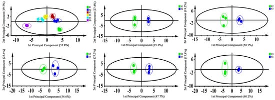 The score plot of pigment contents in O. fragrans ‘Wucaigui’ leaves at different developmental stages as determined by an OPLS-DA. S1: grayish-brown; S2: moderate brown; S3: dark greenish-yellow; S4: strong yellow-green; S5: yellow-green; S6: moderate olive-green.