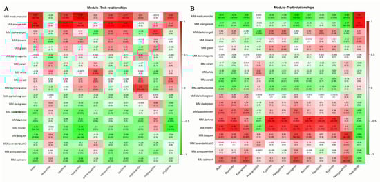 Metabolic substance contents and characteristic modules. (A) Carotenoid characteristic modules. (B) Anthocyanin characteristic modules. Each column represents a metabolic substance and each row represents a genetic module. The number in each grid represents the correlation between the module and the gene. The number in parentheses represents the p-value. The smaller the p-value, the stronger the significance of the representativeness and module correlation.