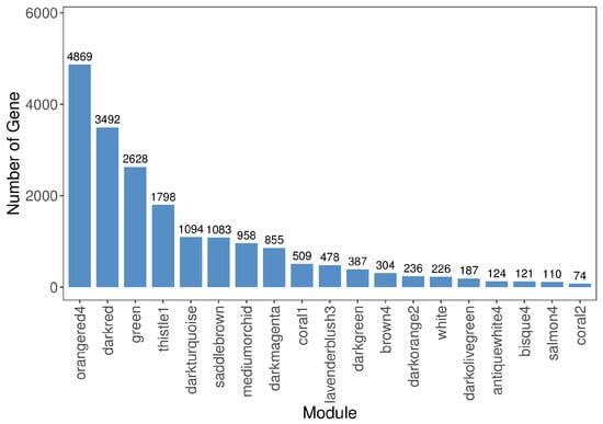 All the sequences were compared with the Gene Ontology (GO) and Kyoto Encyclopedia of Genes and Genomes (KEGG) databases, with the threshold set to E-value < 1 × 10−5, to obtain gene-function-related information [,,,]. Subsequently, the measured metabolome data (chlorophyll, carotenoids, and anthocyanins) and differentially expressed genes (DEGs) were used for a weighted gene co-expression network analysis (WGCNA). Genes with similar expression patterns were put into the same module and a cluster tree was constructed according to gene expression levels and module correlations. We determined the feature modules of interest and calculated the feature module values (MM > 0.9) and gene significance values (GS > 0.5) to identify hub genes.