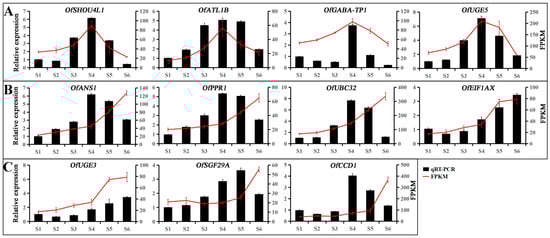 The qRT-PCR validation of the transcriptome data results for hub genes. (A) Hub genes of anthocyanin up-regulation in the ‘white’ module. (B) Hub genes of carotenoid up-regulation in the ‘mediumorchid’ module. (C) Hub genes of carotenoid up-regulation in the ‘orangered 4’ module. S1: grayish-brown; S2: moderate brown; S3: dark greenish-yellow; S4: strong yellow-green; S5: yellow-green; S6: moderate olive-green.