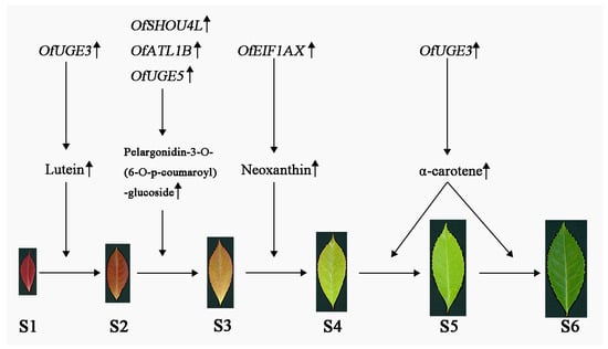 We determined the metabolites involved in the processes of leaf color changes in O. fragrans ‘Wucaigui’. However, the metabolites that play major roles in the whole process of leaf color changes still remained unclear. Consequently, we conducted pair-wise comparisons of six stages of leaf color changes and identified key metabolic substances using OPLS-DA and VIP maximum values (Figure 2 and Figure 3). As shown in Table S2, lutein was the key metabolic substance when the leaf color changed from S1 to S2 and pelargonidin-3-O-(6-O-p-coumaroyl)-glucoside was the key metabolic substance from S2 to S3. Neoxanthin was the key metabolite from S3 to S4 and α-carotene was the key metabolic substance during the change from S4 to S6. These key metabolites provided a foundation for further research on the leaf color changes of O. fragrans ‘Wucaigui’.