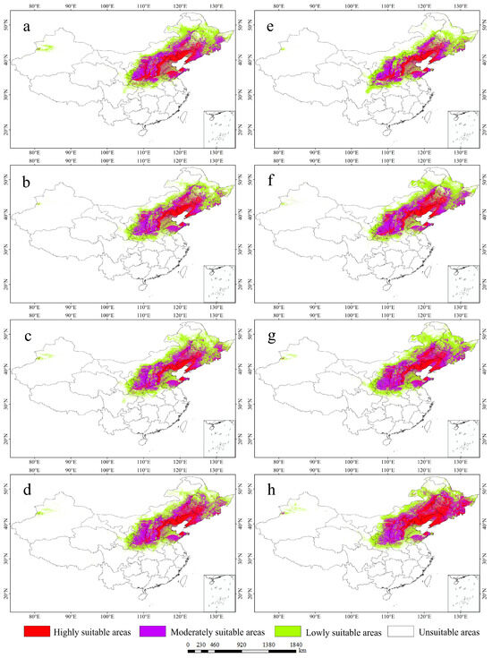 - Leng, W.F.; He, H.S.; Bu, R.C.; Dai, L.M.; Hu, Y.M.; Wang, X.G. Predicting the distributions of suitable habitat for three larch species under climate warming in Northeastern China. For. Ecol. Manag. 2008, 254, 420–428. [Google Scholar] [CrossRef]
