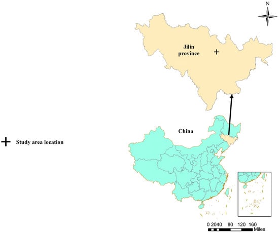 The study site was located in the Hongshi National Forest Park in Huadian City, Jilin Province, Northeast China (42.82° N, 127.13° E) (Figure 1). The park covers an area of approximately 28,577 ha and is characterized by hilly mountainous terrain, with elevations ranging from 400 m to 1000 m. The study site is dominated by the north temperate continental monsoon climate with short, rainy summers and long, cold winters. The average annual air temperature is 3.4 °C. The average annual precipitation is 700–800 mm, most of which falls during the short summer growing season from July to August. There are 125 frost-free days and the main soil types are dark brown, albic, alluvium, and meadow. The forest park has been spared from logging and other human disturbances for the last 30 years.