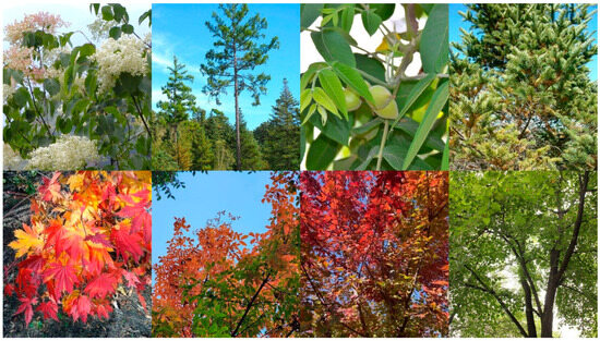 Photographs of study species. Pictured from the first row onwards from left to right are S. reticulata, P. koraiensis, J. mandshurica, A. holophylla, A. pseudosieboldianum, A. triflorum, A. mono, and T. amurensis.