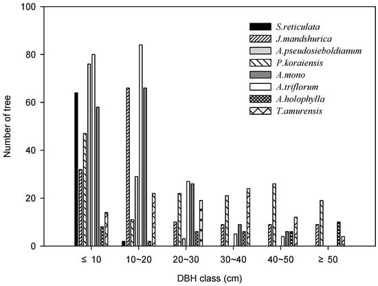 We documented 1351 free-standing living individuals of 22 species belonging to 12 families and 14 genera. The stand was an old-growth forest with a reversed J-shaped distribution of tree diameters when pooled for all species. Of the individuals, 70.61% were in the 1–20 cm DBH class (Figure 3). As S. reticulata is a shrub, the majority of individuals of this species have a diameter at breast height (DBH) of less than 10 cm. P. koraiensis was present in all DBH classes, with more juveniles (DBH ≤ 10 cm) and adult trees than trees with DBH ≥ 40 cm. T. amurensis had an L-shaped distribution of diameters and relatively more adult trees. Six of the eight species had a similar L-shaped distribution with a high concentration of younger trees, indicating that the forest was regenerating.