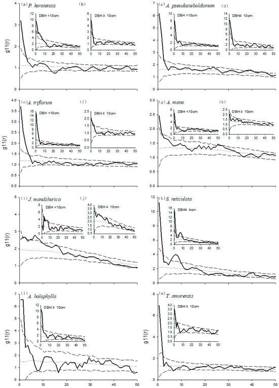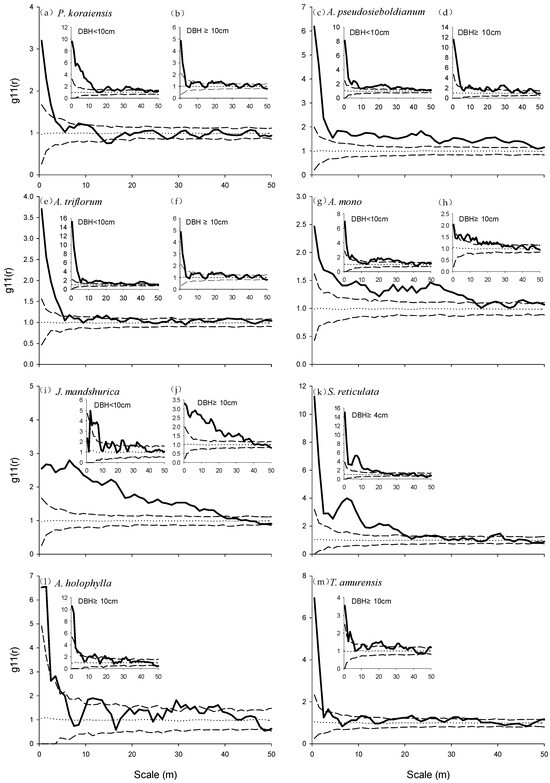 P. koraiensis juveniles exhibited an aggregated distribution in the range of 0–7 m and a random distribution at other scales. Adult trees were only found to aggregate within the range of 0–1 m. J. mandshurica juveniles showed an aggregated distribution at 2 m and 4–7 m, and the adult trees were clustered in the range of 0–5 m. Juvenile trees of J. mandshurica showed an aggregated distribution at scales of 0–2 m and 23 m and at 0–3 m for the adult trees. The juvenile trees of A. triflorum clustered at the 0–3 m and 39–43 m scales, but the adult trees showed a random distribution at all scales. At the 0–1 m scale, only the juveniles of A. mono were clustered, while the adult trees were randomly distributed at all scales. The degree of aggregation in the juvenile class species decreased significantly at small scales as DBH increased, except for A. pseudosieboldianum. Both S. reticulata and A. holophylla showed aggregated distributions in the range of 0–1 m, while T. amurensis was aggregated at all scales. In addition to adult A. triflorum trees, A. mono and T. amurensis were randomly distributed at all scales. The other species showed a similar spatial distribution being aggregated at small scales and gradually becoming less so as the scale increased, ultimately resulting in a random distribution. After habitat heterogeneity was excluded, the five tree species in the juvenile class tended to aggregate at the 0–10 m scale, and eight tree species in the adult class tended to aggregate at the 0–5 m scale, with the exception of S. reticulata, which mainly aggregated at the scale of 0–10 m.