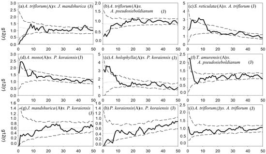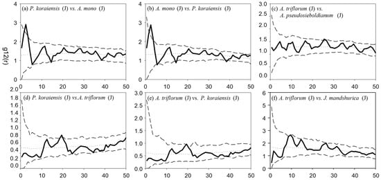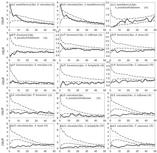 Using bivariate statistics, we performed a total of 56 (8 × 7), 56 (8 × 7), and 20 (5 × 4) bivariate point pattern analyses for all individuals of the eight species in the adult class and the five species in the juvenile class. The results of the GoF test showed significant negative associations (repulsion) for three pairs: J. mandshurica vs. A. pseudosieboldianum at 1–4 m, A. pseudosieboldianum vs. A. triflorum at 1–4 m, and A. triflorum vs. A. pseudosieboldianum at 0–4 m. Additionally, positive associations (attraction) were found for seven pairs at small scales (refer to Table 1). At scales of 0–4 m, A. triflorum and A. pseudosieboldianum showed a negative association. Six out of seven pairs with positive associations were found to be symmetric (in S. reticulata vs. J. mandshurica, P. koraiensis vs. A. mono, and P. koraiensis vs. A. holophylla). At scales of 0–2 m and 6–9 m, there was a positive association between S. reticulata and J. mandshurica, while at scales of 0–9 m, there was a positive association between J. mandshurica and S. reticulata. Additionally, at scales of 1–4 m, there was a significant positive association between P. koraiensis and A. mono. At scales of 1–3 m, there is a positive association between P. koraiensis and A. holophylla. Similarly, at scales of 2–5 m, there is a positive association between A. holophylla and P. koraiensis. Additionally, the pair of P. koraiensis and A. pseudosieboldianum showed a positive association at scales of 7–9 m. In our methodology, we described the pair correlation function g(r), which represents the probability of a species occurring within a certain distance (scale) from a given point, forming a ring around it. The ranges mentioned in the text, such as 0–2 m and 6–9 m, denote the widths of these rings, which are incrementally increasing. Thus, any scale can be calculated accordingly. However, the data in the table are aggregated based on a 5 m scale, which includes all rings within that width. We also analyzed the spatial associations among the individuals of each species in two size classes. When comparing the spatial associations among small trees (DBH < 10 cm, or DBH < 4 cm for S. reticulata), the GoF test revealed that only 2 of 20 pairs significantly departed from the HP null model (Figure 6); P. koraiensis vs. A. mono and A. mono vs. P. koraiensis, which showed positive correlations at small scales of 2–3 m.
