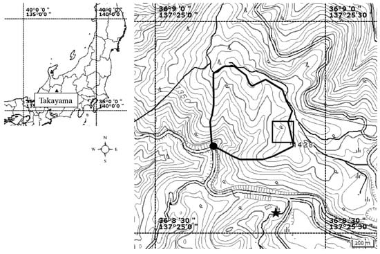 Location of the study site at Takayama Forest Research Station (★). A square indicates a permanent study plot (100 m × 100 m). The water catchment area is marked with black lines. A solid black circle indicates the location of a weir. The map was obtained from the Geospatial Information Authority of Japan.