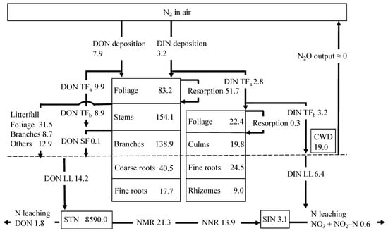 This study can provide a comprehensive understanding of the forest N cycle, but there are some inadequacies. One limitation is the inconsistency in sampling time, which could lead to inaccurate data integration. For example, our sampling period of tree fine root biomass, N pools in soil, the necromass of CWD, and the N requirements of the stems, coarse roots, and fine roots of trees and bamboo was relatively long. Previous studies have found that fine root biomass increases with stand development and then decreases or tends to remain stable [47,48,49,50]. The TKY forest site is 60–70 years old and remains in good condition, implying that the fine root biomass remains in a stable state. We also considered that the soil N pool was stable due to reduced N leaching and N2O output. Elevation, human impact, and forest structure are the most important factors in CWD accumulation [51,52]. We assumed that no extreme temporal change in CWD occurred in the study plot [53] because it is sheltered from human interference. It was reported that the interval annual variations in NPP were minimal in the study site [39]. Therefore, the effects of inconsistent sampling times were negligible in this study.