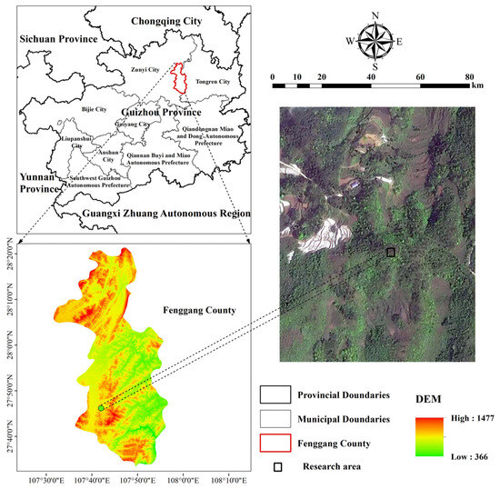 All field research was conducted along the Tianhe Mountain in Fenggang County, Zunyi City, Guizhou Province, China (107°31′20″–107°56′42″ E, 27°32′13″–28°1′14″ N). The area has a humid subtropical monsoon climate with four distinct seasons, an average annual temperature of 15.2 °C, and an average annual rainfall of 1116.1 mm. Forest resources are abundant and include trees such as P. massoniana, Q. fabri, Phyllostachys heterocycla, and Cryptomeria fortunei; shrubs such as Serissa japonica Thunb., Lindera fragrans Oliv., and Camellia japonica L.; and herbs like Ophiopogon bodinieri and Carex rigescens. The sketch map of the study area is shown in Figure 1.