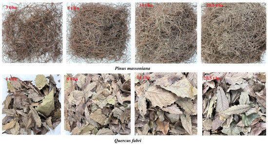 Captured color images of artificially created fuel beds with different fine dead fuel loads of coniferous P. massoniana and broad-leaved Q. fabri material.