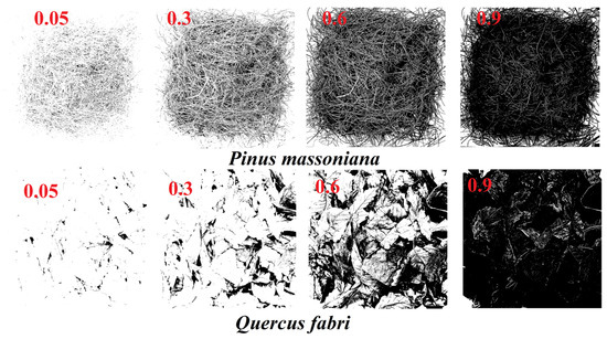 Prior to extracting the Euler number, all images were binarized, which benefits further image processing by reducing the amount of available data and facilitating the highlighting of contours [28]. First, a grayscale intensity threshold is selected; any pixel value exceeding this threshold in the source image was replaced with white, while those under the threshold were set to black, thereby converting a color image into a two-color black and white image. This step was conducted using the ‘im2bw’ function in MATLAB R2023b platform (MathWorks, Natick, MA, USA). The threshold range of the function was set at 0–1 to reflect potential pixel values of up to 256, with 0 representing a pixel value of zero, 1 representing a pixel value of 256, and a threshold of 0.5 corresponding to a pixel value of 128. To analyze the impact of Euler numbers obtained from different thresholds on the results, this study used a range of thresholds from 0.05 to 0.95, with increments of 0.05. Selecting different thresholds for each image to binarize and extract Euler numbers, as there are 19 threshold gradients, each image has 19 Euler numbers. Euler numbers were obtained from images binarized at different conversion thresholds via the ‘bweuler’ function in MATLAB R2023b. To better demonstrate the effect of binarization, Figure 3 shows binary images of the P. massoniana coniferous and Q. fabri broad-leaved fuel beds with a fixed load of 9 t/ha (example of a partial threshold).