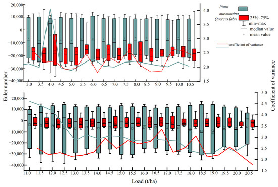The Euler numbers extracted from images of coniferous and broad-leaved beds under different load levels were expressed as mean, median, minimum, and maximum values.