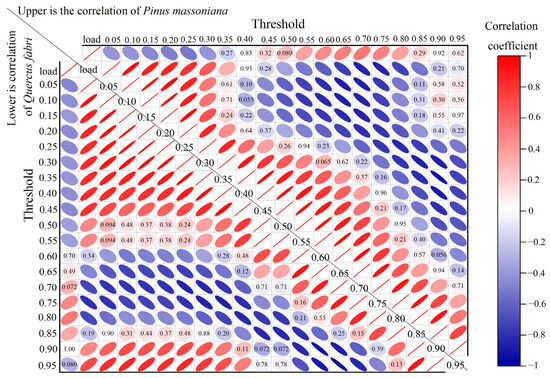 Heatmap of the correlation between fine dead fuel load and corresponding image Euler numbers for P. massoniana and Q. fabri fuelbeds. Note: The elliptical represents the correlation between the load and Euler number under different thresholds, with blue indicating a negative correlation and red indicating a positive correlation. The darker the color, the stronger the correlation. The value in the cells represents the correlation coefficient.