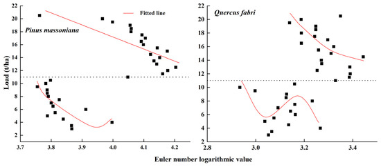 Figure 6. The variation of fine dead fuel load of P. massoniana and Q. fabri fuelbeds with the logarithmic value of Euler numbers extracted from images.