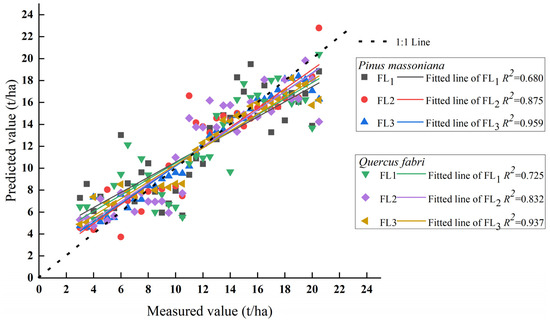 In Figure 8, three 1:1 graphs of the three models are shown. In the case of both P. massoniana and Q. fabri fine dead fuels, the random forest model exhibited the best predictive performance, with the fitting line being closest to the 1:1 line. For FL1, predicted values were higher at low fuel loads, and the predictive value decreased as the measured load increased. The predicted values for FL2 and FL3 were generally low.