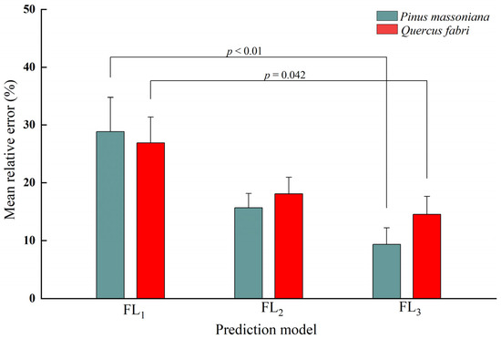 In our differential analysis, and for both coniferous and broad-leaved fine dead fuels, the MRE of the FL3 model was significantly lower than that of the FL1 model, and there was no significant difference between the predictive value of the FL3 and the FL2 models (Figure 9).