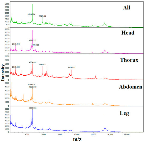 Our study revealed that using chest protein specimens results in a large number of spectral peaks, high peak values, and high reproducibility. This is consistent with the findings in the mosquito protein profile establishment, suggesting that the protein content in the chest is high and more stable [