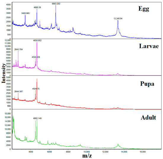 H. ligniperda, it was found that pupae, larvae, and adults all contain the same main peak, but there are still differences in the secondary peak. Among them, it is worth mentioning that the protein mass spectrometry peaks of a single egg of