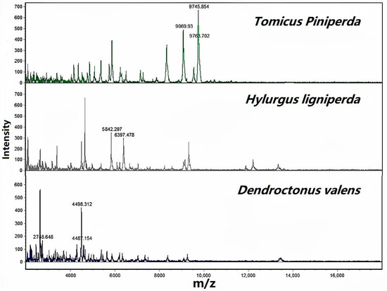 T. piniperda. They all belong to the order Coleoptera. The results showed that significant differences were observed in the MALDI-TOF MS spectra between different species, displaying rich species-specific information. The mass spectra of the same species showed high consistency, repeatability, and reproducibility. The experimental results confirmed the construction of a reference database using MALDI-TOF MS mass spectrometry of the long forest beetle and its related species, and the sample chest protein extract is sufficient to identify species categories using the MALDI-TOF MS method. The results obtained using this method confirm the identification results obtained using morphological methods. The validity of the database was established by a blind test; in this test, when there is a corresponding reference spectrum in the database, the specimen can be correctly identified by MALDI-TOF MS [