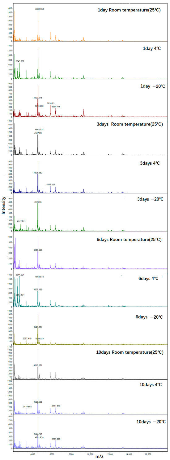 The protein profile was obtained using the CPRO-180 real-time workstation system. Linear positive ion mode was used to collect specimens in the mass range of 2–20 kDa. Each target plate was externally calibrated using the reference strain Escherichia coli CICC 10389, one of the key steps to ensure the accuracy and reliability of the experimental results. Each mass spectrum corresponds to the ions obtained from 300 laser emissions from six regions at the same point. The Spectrum Viewer software was then used to analyze and compare the obtained spectra.