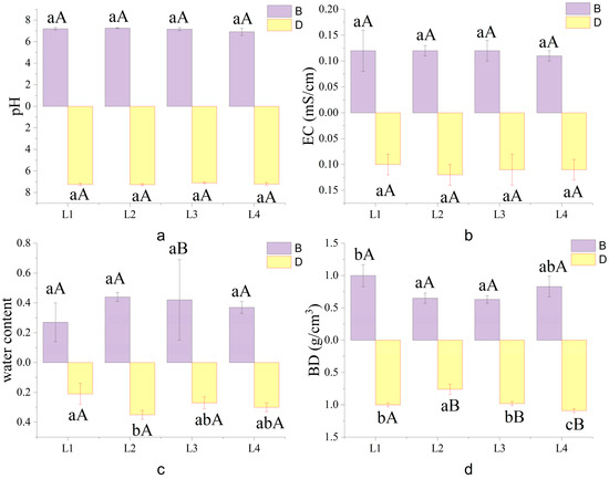 | L1-D | 13.11 ± 7.84 aA | 11.21 ± 3.77 aA | 9.44 ± 6.37 aA | 76.00 ± 28.48 aA | 13.72 ± 0.30 aB | 1.07 ± 0.72 aA | 0.34 ± 0.15 aA | 20.40 ± 1.22 bA |