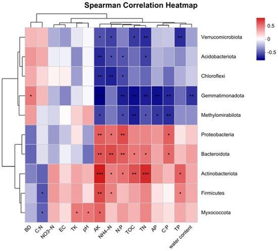 3.5. Soil Physicochemical Properties and Individual Bacterial Community Correlation Analysis