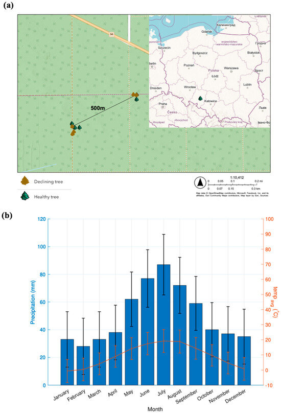 (a) Location of the sampled trees in Opole and Poland and scale; (b) the average monthly sum of precipitation (blue bars) and average temperature (red line) at the meteorological station in Opole; the error bars show the standard deviation. Reference period 1975–2022.