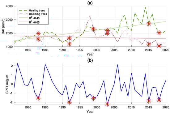 (a) Annual Basal Area Increment (BAI) for healthy and declining groups of trees with fitted trend lines. (b) Standardized Precipitation–Evapotranspiration Index (SPEI) data for August. The asterisk symbol indicates years (1983, 1992, 1999, 2003, 2015, 2018), with particularly low August SPEI (<1.5).