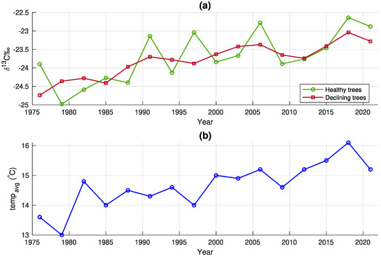 (a) δ13C chronologies for healthy and declining trees, and (b) average values of average monthly temperatures during the growing season (April–October).