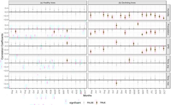 Correlation coefficients between δ13C and meteorological parameters (relative humidity, precipitation, SPEI, maximum temperature, average temperature) for (a) healthy trees and (b) declining trees. Months in lowercase refer to the previous year, while months in capital refer to the current year. The correlation’s average is represented by the point, and its 95% confidence interval, derived from 1000 bootstrap samples, is shown by the error bar [67]. Red bars indicate a statistically significant correlation (p < 0.05).