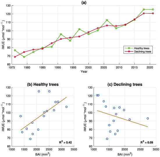 (a) iWUE chronologies for healthy and declining trees; (b) relationship between Basal Area Increments (BAI) and intrinsic water-use efficiency (iWUE) for healthy trees (c) and declining trees.