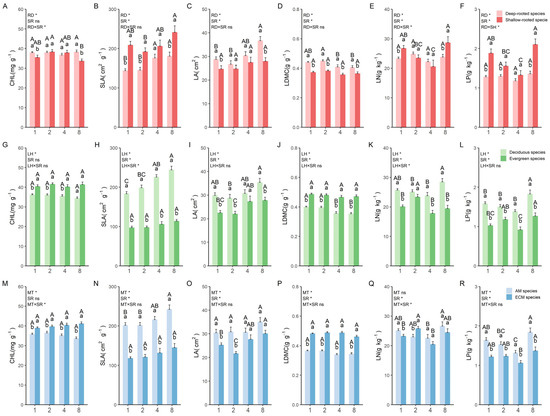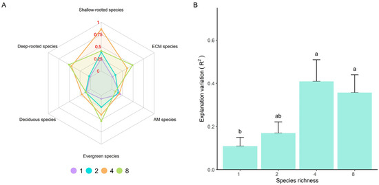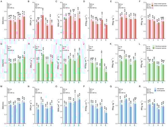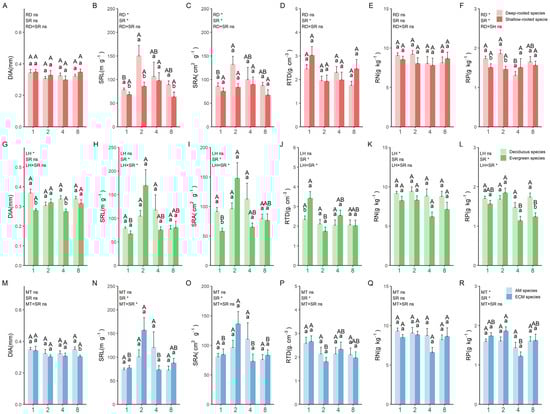 3.1.2. Variations in Absorptive Root Traits across Different Trait Categories at Different Species Richness Levels