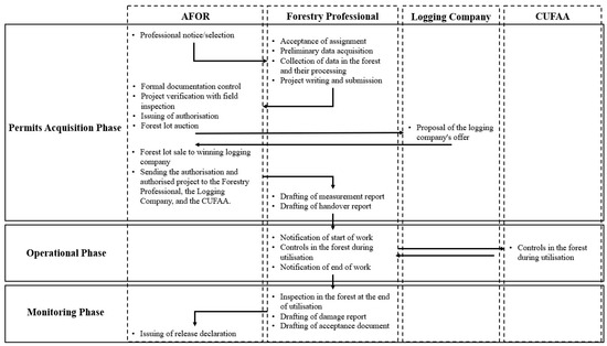 In the operational phase, the administrative procedure is very reduced. Under normal conditions, it mainly involves the FP, who must draw up the notification document for the start of the works, carry out the forest controls during the use of the forests, and draw up the notification document for the end of the work.