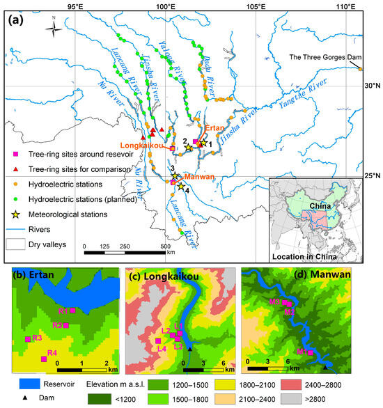 Location of the tree-ring sites, hydropower stations, dry valleys, and meteorological stations. The tree-ring sites for comparison denote tree-ring width sites established by others from NCEI (https://www.ncei.noaa.gov/maps/paleo/ (accessed on 10 March 2024)). Here, we only show the hydropower stations on rivers Lancang, Jinsha, Yalong, and Dadu. Numbers 1–4 represent the meteorological stations Miyi, Huaping, Nanjian, and Jingdong. Panels (b–d) zoom in the details around reservoirs Ertan, Longkiakou, and Manwan in panel (a). The locations of the dry valleys were referred to the Integrated Scientific Expeditional Team to the Qinghai–Tibet Plateau [31].
